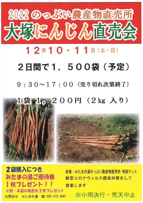さて、今年も12月10日、11日にのっぷい農産物直売所特産の「大塚にんじん直売会」を下記の日程で開催します。
