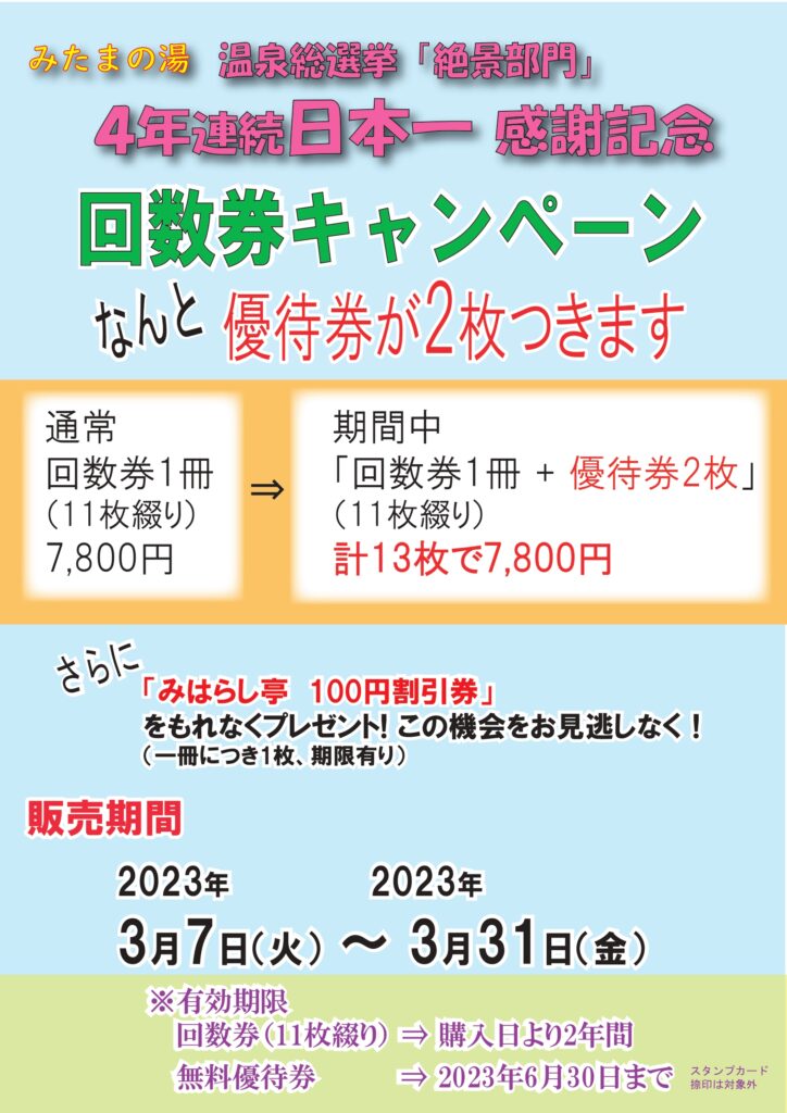 さて、このたびの温泉総選挙「絶景部門」4年連続日本一を記念し、「回数券キャンペーン」を本日より開催します。