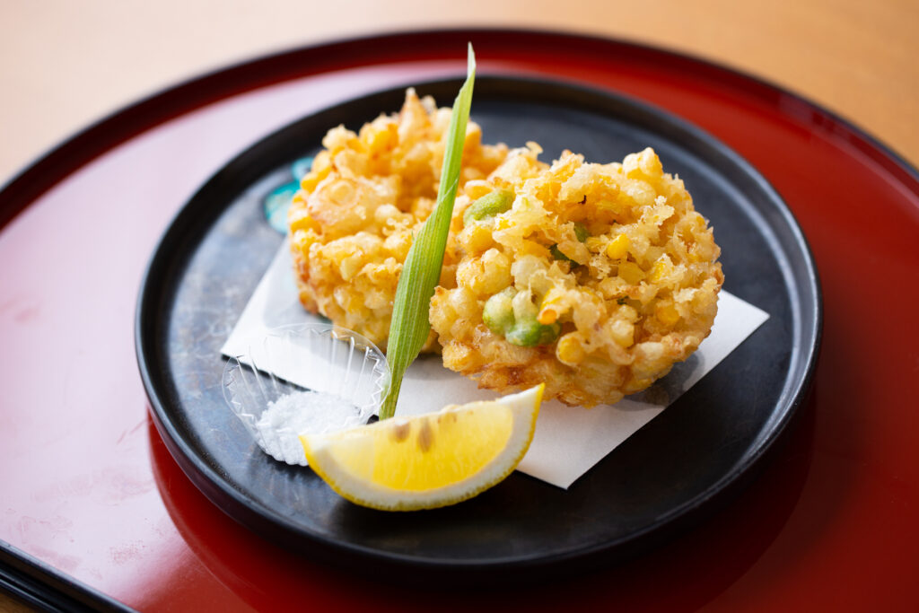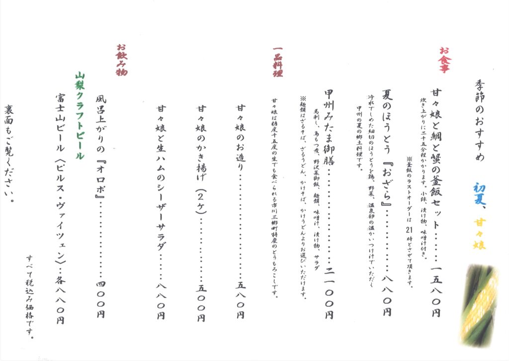 5月下旬から6月下旬までは、特産のスイートコーン「甘々娘」を使ったメニューを展開しています。市川三郷町大塚地区で収穫された甘々娘を、ひと手間かけて提供しております。