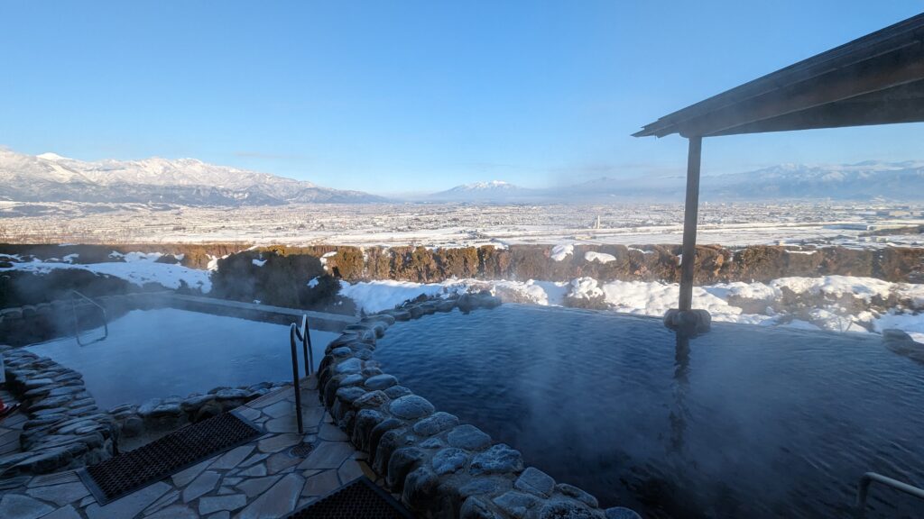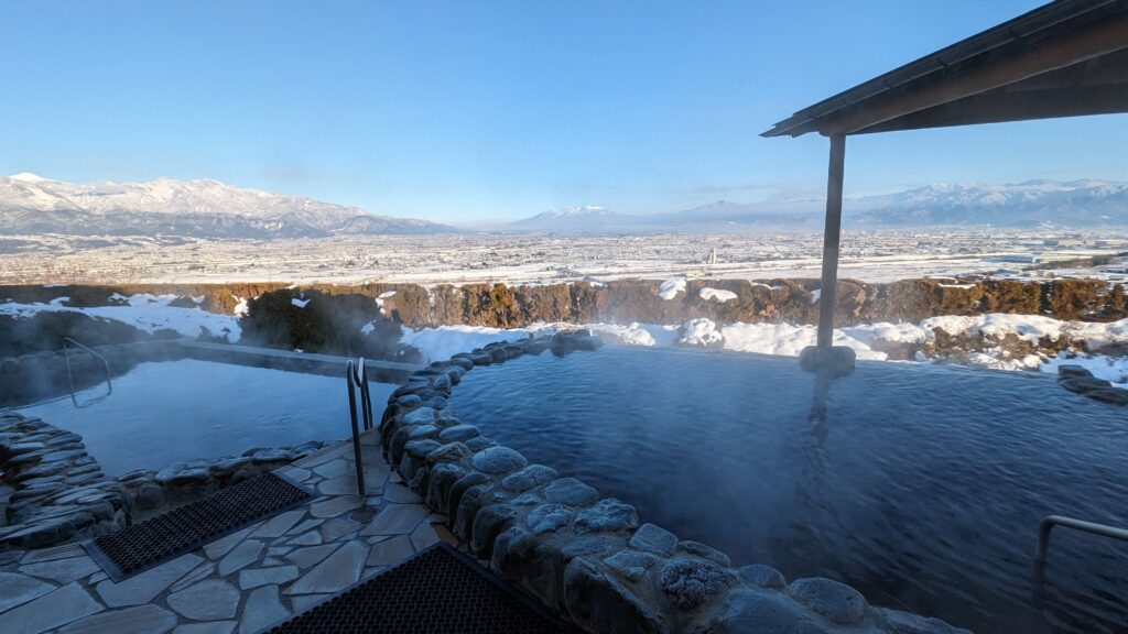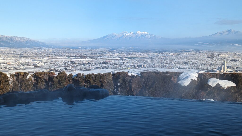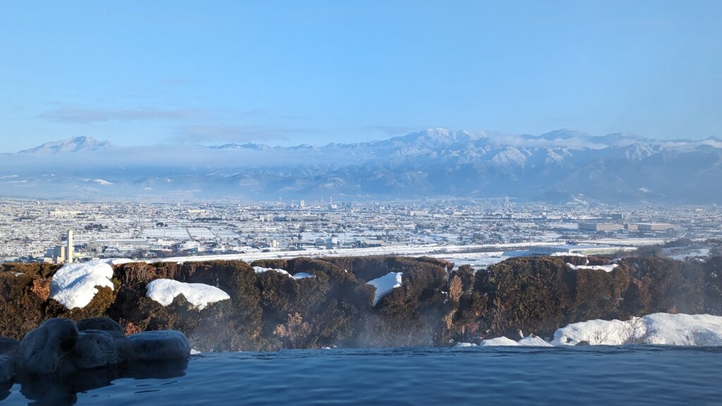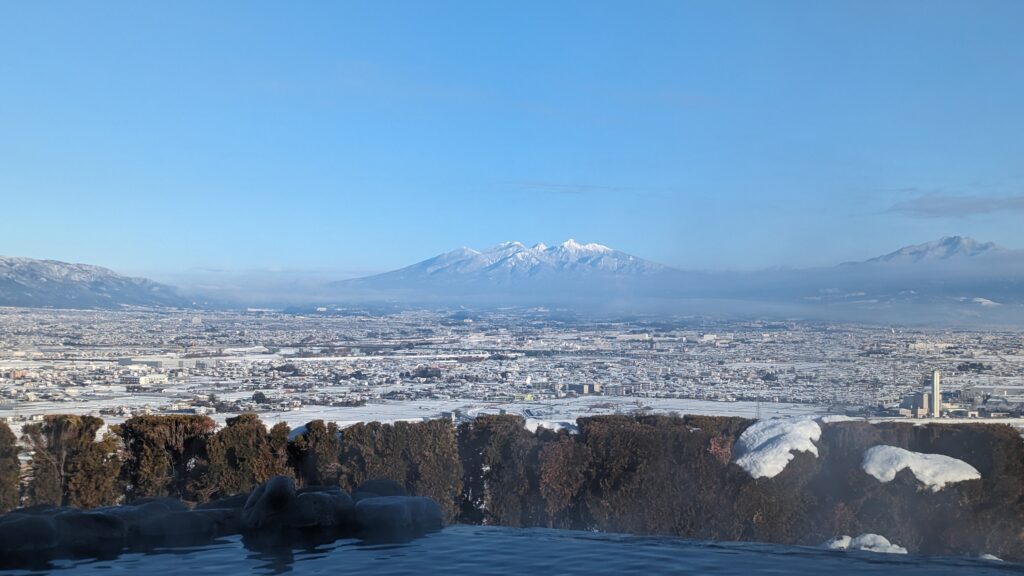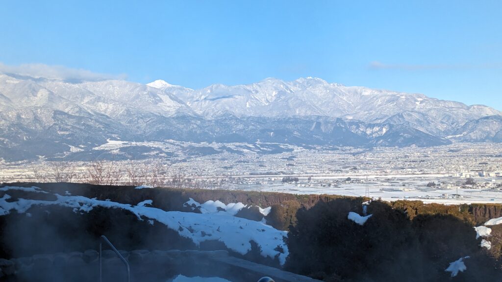 さて、本日は晴天となり山梨百名山の山々と、甲府盆地が白く一色に染まった雪見風呂をご覧いただけます。2024年2月7日限定の景色を是非お楽しみください。