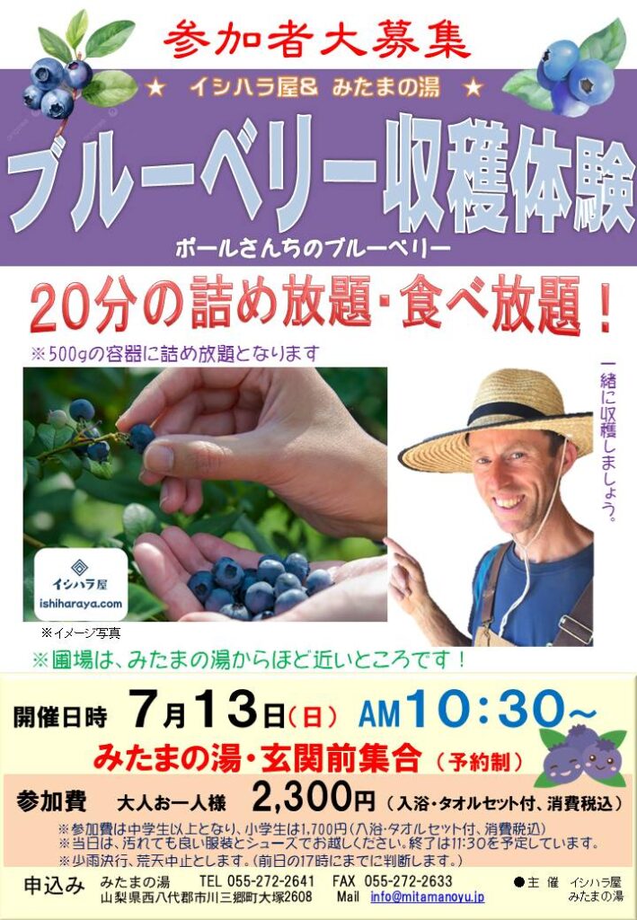 さて、のっぷい農産物直売所特産のスイートコーン「甘々娘」と「ドルチェドリーム」の収穫が終わろうとしているなか、桃やブルーベリーの果物が店頭に並んでいます。みたまの湯周辺の畑では、ちょうどブルーベリーが収穫時期となりましたので、下記の日程で収穫体験(詰め放題・食べ放題)を開催します。参加ご希望の方は、URLをクリックし、お名前、郵便番号・住所・電話番号・E-mailを入力し、ご用件欄に「ブルーベリー収穫体験、参加人数」をご入力てください。