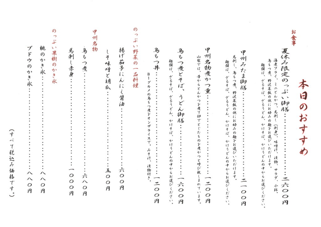 とりもつ煮や馬刺、野沢菜飯、そばがセットになった「甲州みたま御膳」。その「甲州みたま御膳」に海老フライとミニとんかつをプラスした、猛暑を吹き飛ばすスタミナ満点の「のっぷい御膳」をはじめ、とりもつ煮とそばがセットになった「とりもつ煮とそば御膳」や「甲州煮かつ重」などをご用意しております。また、わがまち市川三郷町で収穫されたナスを素揚げした「揚げ茄子にんにく醤油」や、甲州名物の「とりもつ煮」など、みたまの湯でしか味わえないメニューもご用意しております。ぜひ、温泉と一緒にお食事もお楽しみください。皆様のご来店をスタッフ一同、お待ちしております。