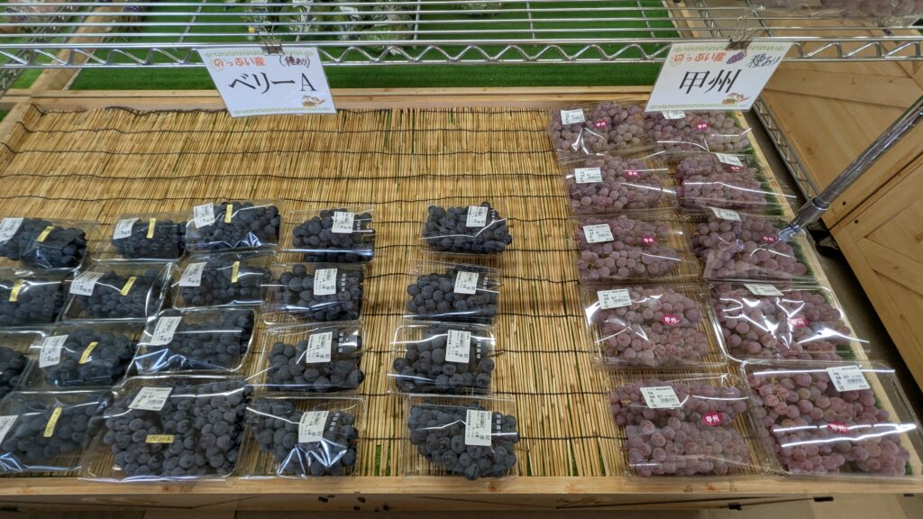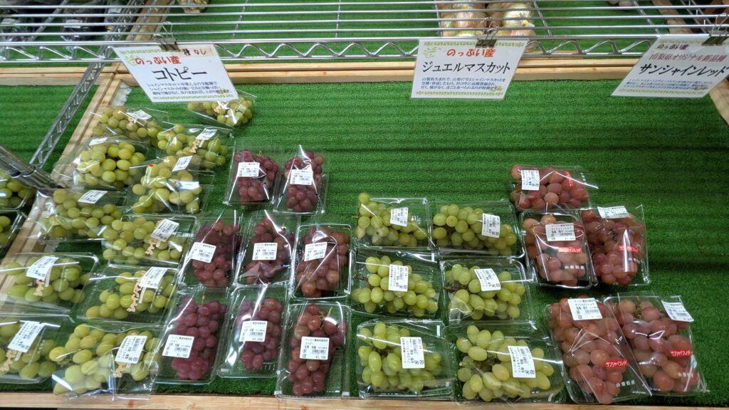 のっぷい農産物直売所では、ブドウがそろそろ終了を迎えます。10/2時点ではシャインマスカットをはじめ、ジュエルマスカット、コトピー、サンシャインレッド、ベーリーA、甲州が入荷しております。また、地元特産の大塚なすやキュウリなども終わりを迎えようとしておりますので、今シーズンまだ召し上がっていない方は、急に無くなってしまうこともございますのでお急ぎください。温泉と一緒に、山梨の旬な農産物のお買い物をぜひお楽しみ下さい。皆様のご来店をスタッフ一同、お待ちしております。