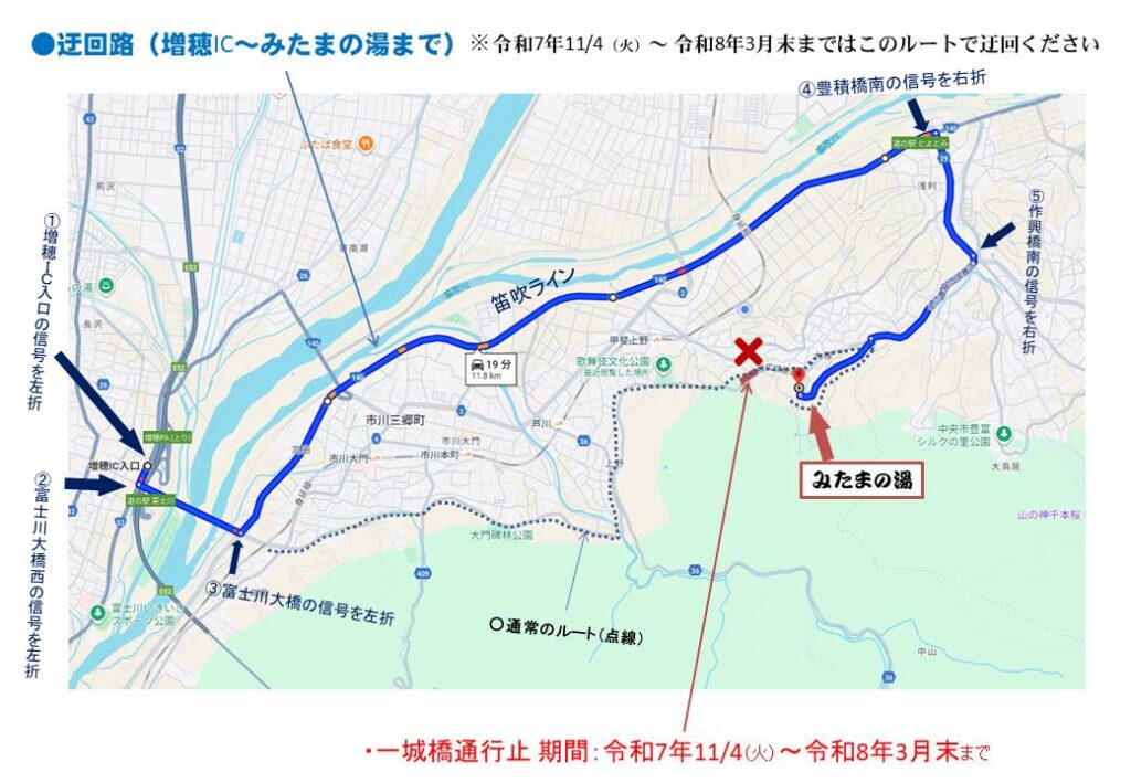 耐震補強工事のため、みたまの湯と歌舞伎文化公園の間にある「一城橋」が、下記の期間、昼夜全面通行止めになります。広域農道を市川三郷町・富士川町方面からお越しのお客様や、中部横断道を利用し、静岡方面からお越しになるお客様はご注意いただきますようお願いいたします。