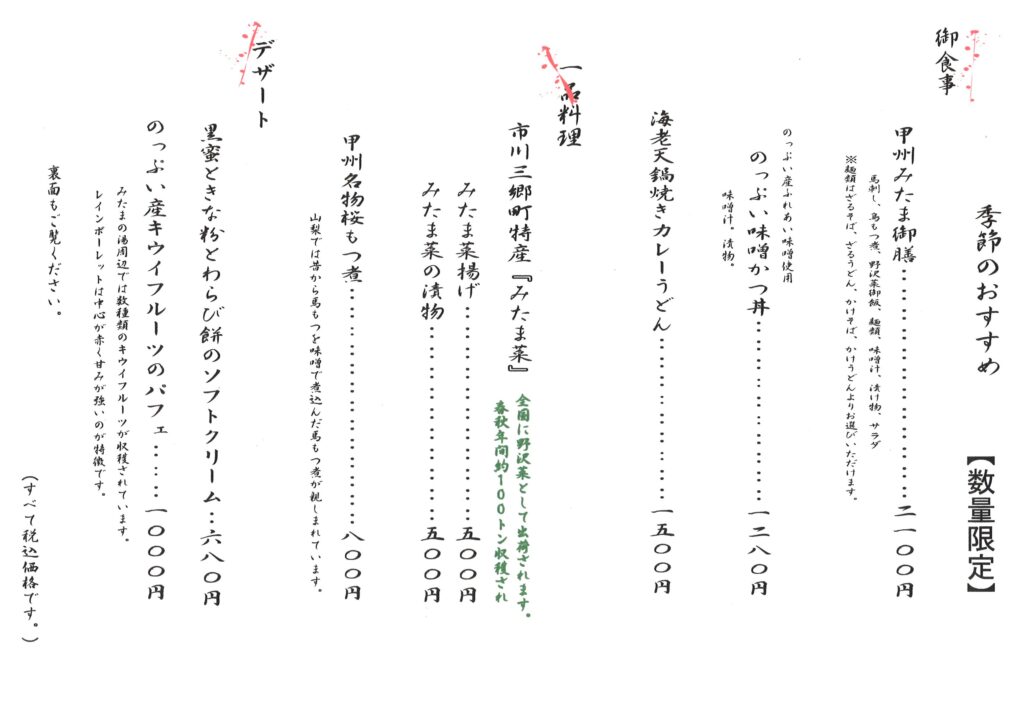 日頃より、みたまの湯をご愛顧いただき誠にありがとうございます。食事処「みはらし亭」の旬な季節おすすめメニューを紹介させていただきます。