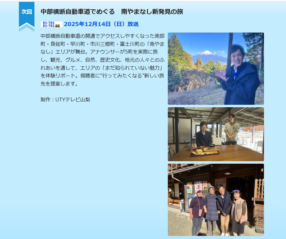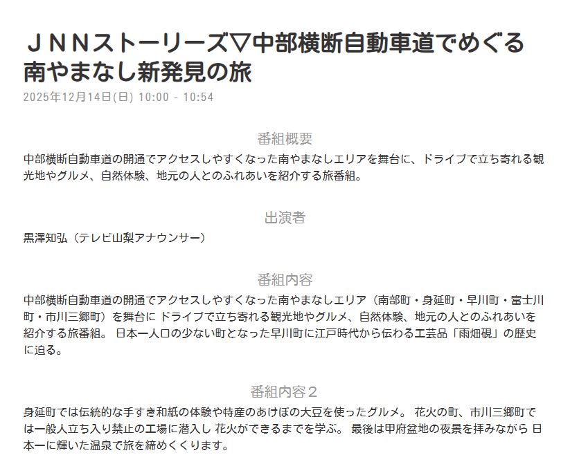 「中部横断自動車道でめぐる、南やまなし新発見の旅」が、下記の日程で放送されます。南山梨とは、わがまち市川三郷町、富士川町、身延町、早川町、南部町の合計5町で、観光名所やグルメなどの旅番組となっています。みたまの湯も魅力をたっぷりに放映されますので、ぜひご覧くださいませ。