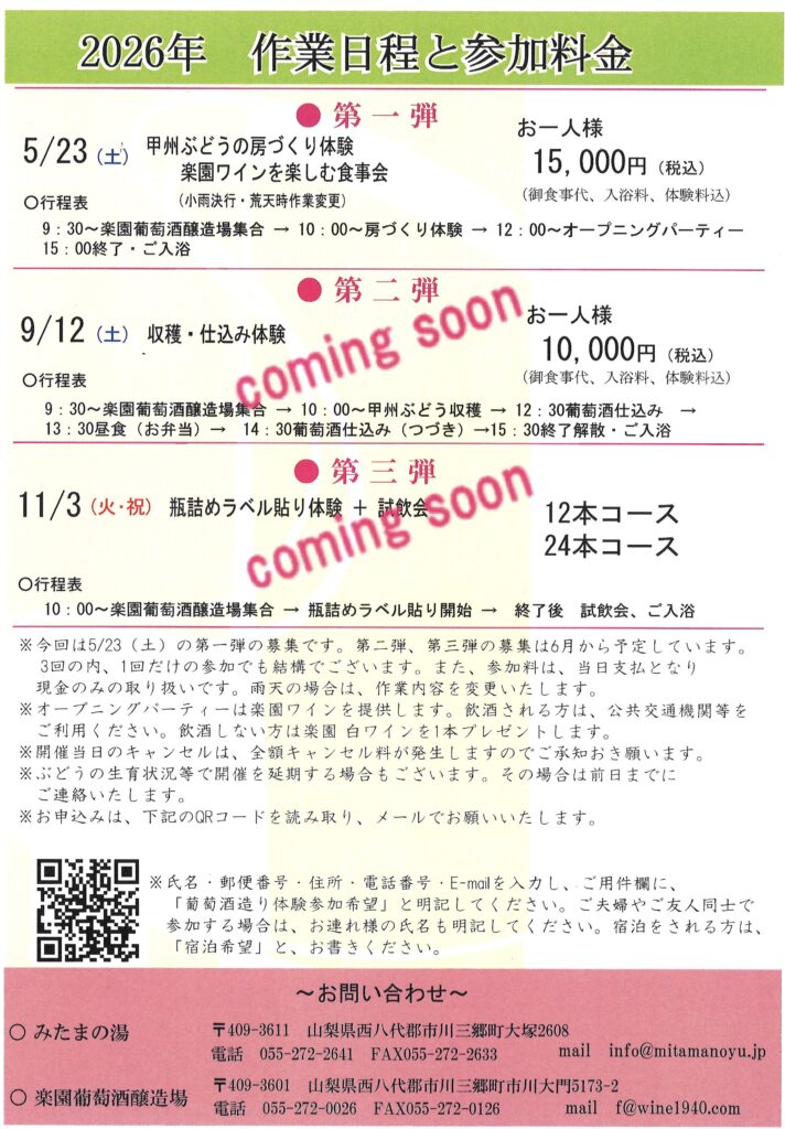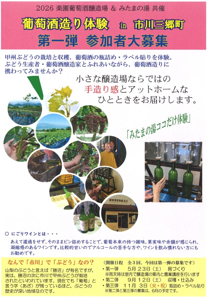さて、昨年に引き続き、楽園葡萄酒醸造場とみたまの湯共催の「2026葡萄酒造り体験」を開催します。この体験は、甲州ぶどうの房づくり → 収穫・仕込み → 瓶詰め・ラベル貼りのワインが造られる工程を体験するイベントです。また、市川三郷町にある楽園葡萄酒醸造場で造られる、ここだけでしか味わえないワインを、地域のレストランの料理と一緒に堪能いただき、市川三郷町を好きになっていただきたい想いで作ったイベントでもあります。