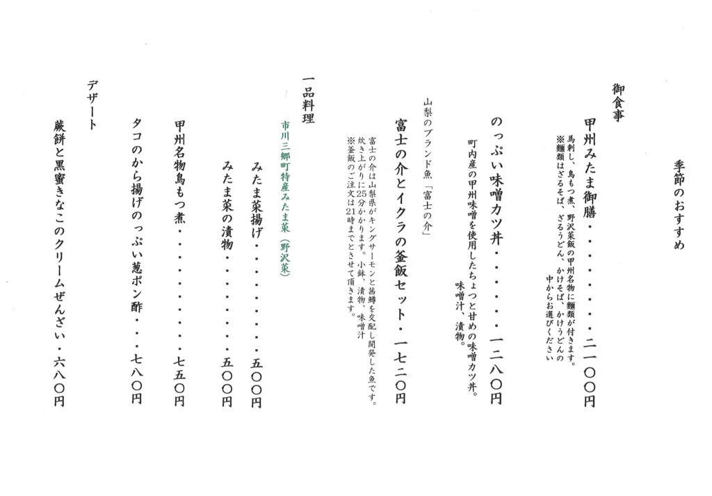 のっぷい農産物直売所で販売しているお味噌を使った、人気の「のっぷい味噌カツ丼」をはじめ、とりもつ煮や馬刺、野沢菜飯、そばがセットになった「甲州みたま御膳」、海老フライとマグロの刺身がセットになった「海老フライと刺身御膳」、山梨ブランド魚の富士の介を使用したの「富士の介とイクラの釜飯セット」をメインに展開しています。