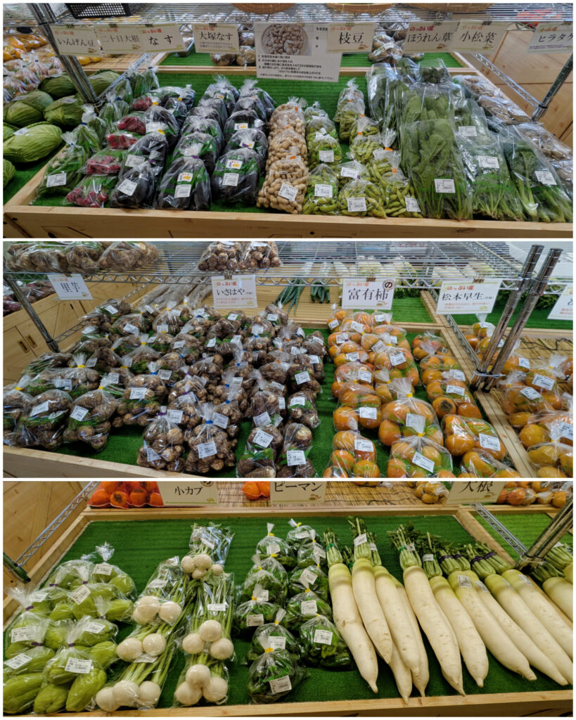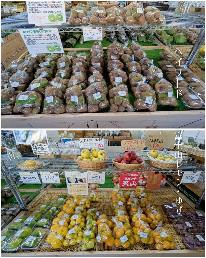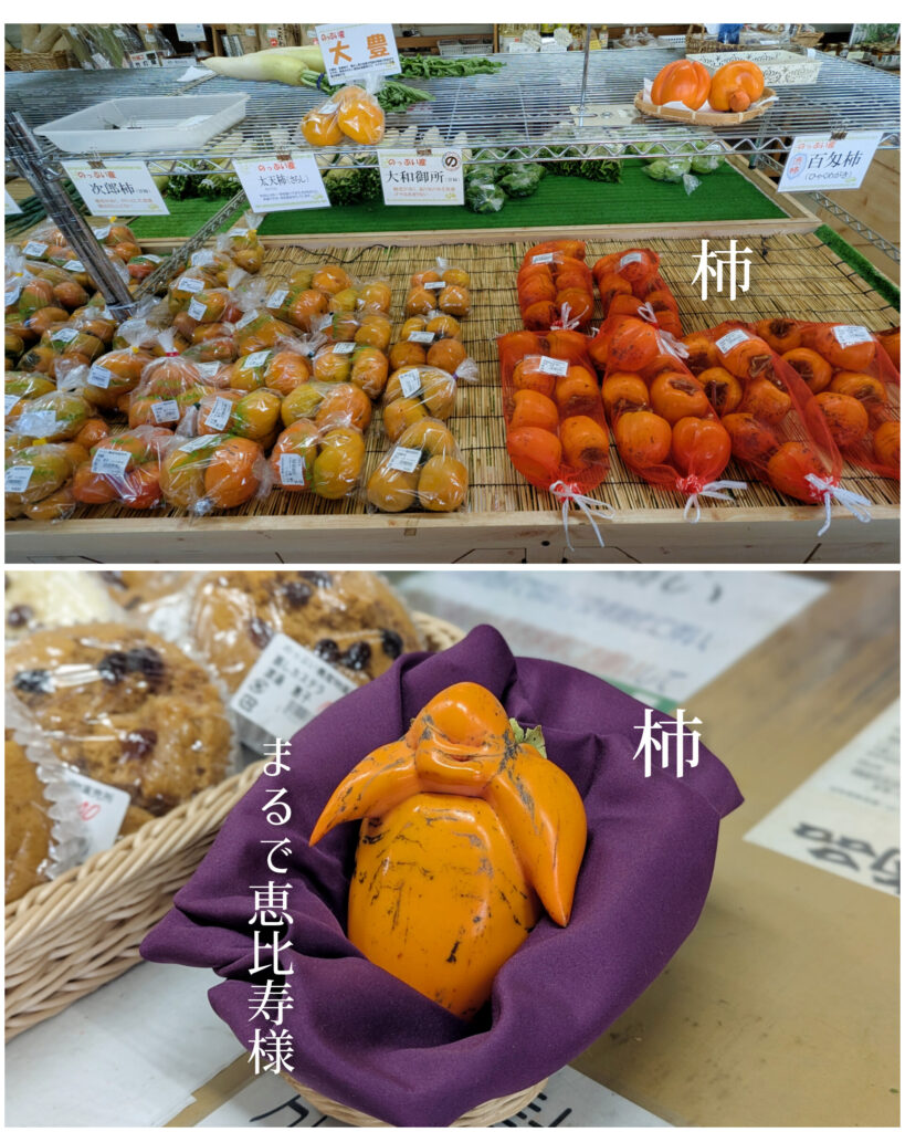 のっぷい農産物直売所では、秋の果樹であるキウイフルーツのレインボーレッドやヘイワード、地域ブランドを目指している富士山レモン、甘柿、渋柿の甲州百目柿など入荷しております。恵比寿様に似た変形の柿もレジ付近に展示していますので、ぜひご覧ください。また、大根やねぎ、白菜、里芋、長芋など秋の味覚が揃っております。温泉と一緒に農産物のお買い物もお楽しみください。皆様のご来館をスタッフ一同、お待ちしております。